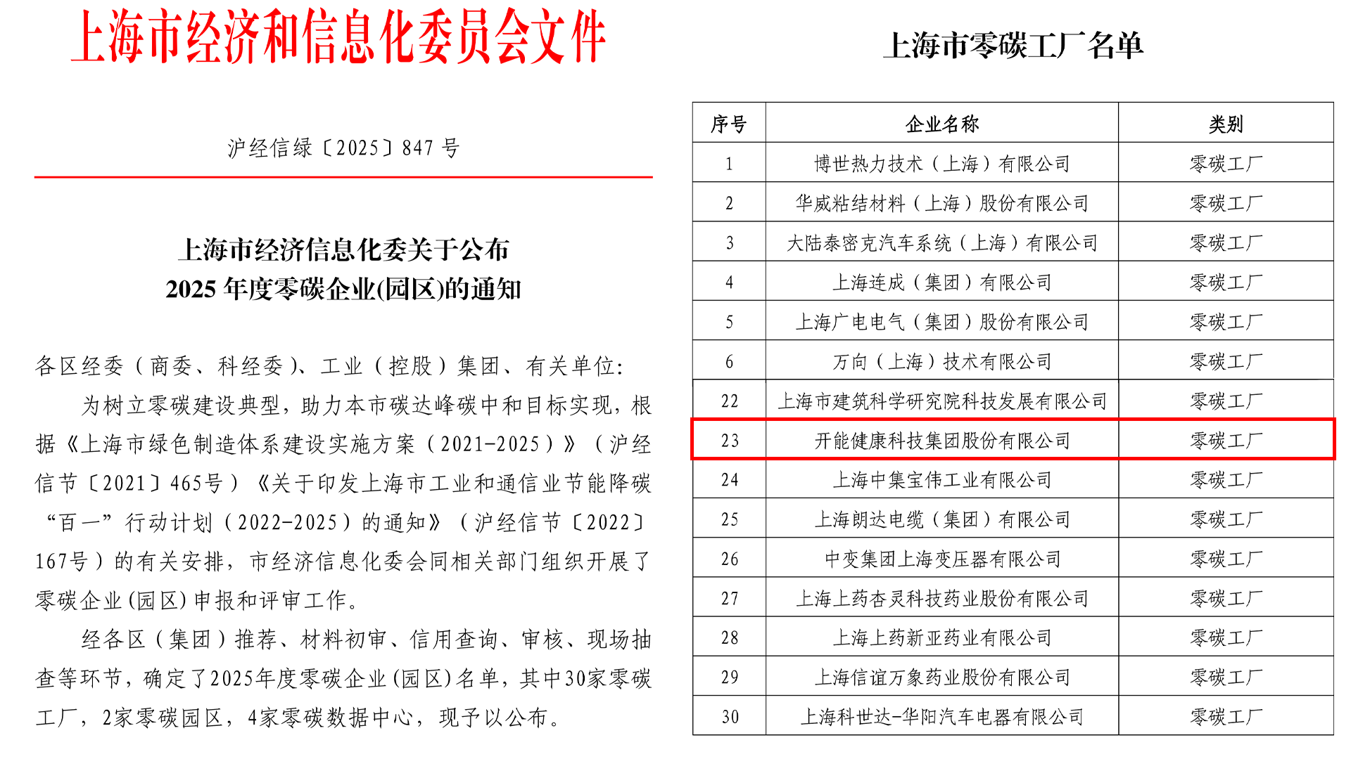 開能健康上榜上海市零碳工廠名單