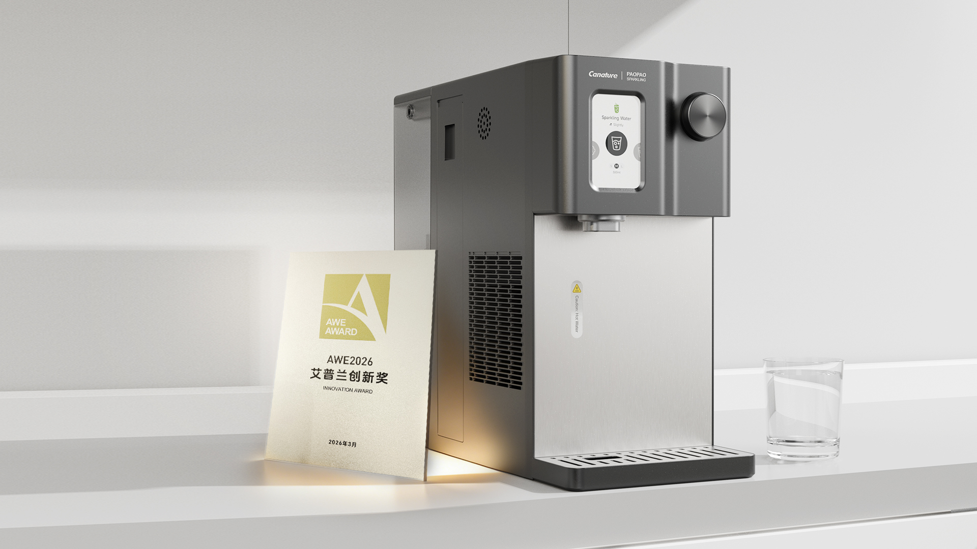 一直以來,開能健康堅持“設計+技術”雙輪驅動,在深耕水處理技術的同時,也注重產品美學與用戶體驗的打磨。這種積累,讓開能產品在展會上收獲了一份來自行業(yè)的認可——臺上冰氣泡凈飲一體機榮獲AWE 2026艾普蘭創(chuàng)新獎。